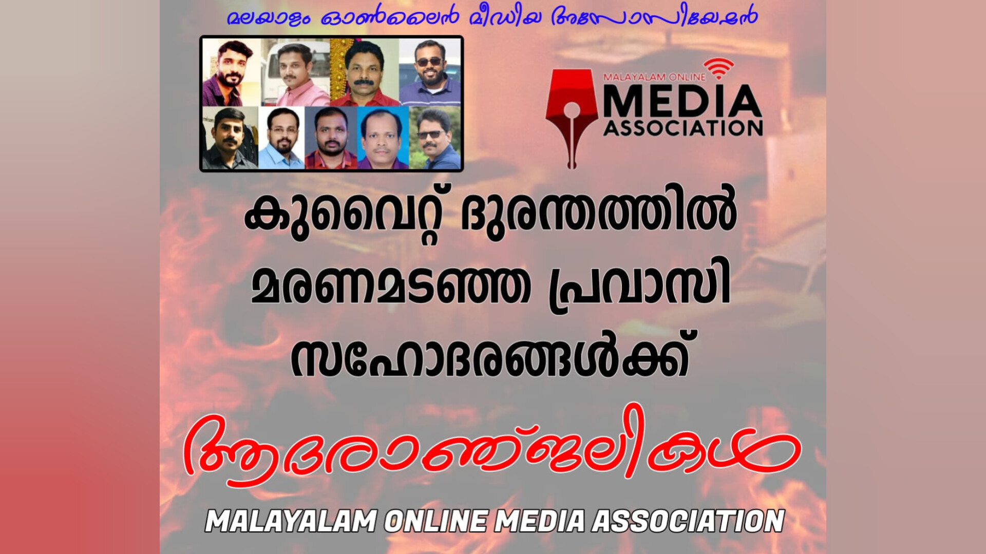 കോട്ടയം: കുവൈറ്റിലെ മംഗാഫിലെ തൊഴിലാളി ക്യാമ്പിൽ ഉണ്ടായ തീപിടുത്തത്തിൽ മരിച്ച സഹോദരങ്ങൾക്ക് ആദരാഞ്ജലികളർപ്പിച്ച് മലയാളം ഓൺലൈൻ മീഡിയാ അസോസിയേഷൻ.