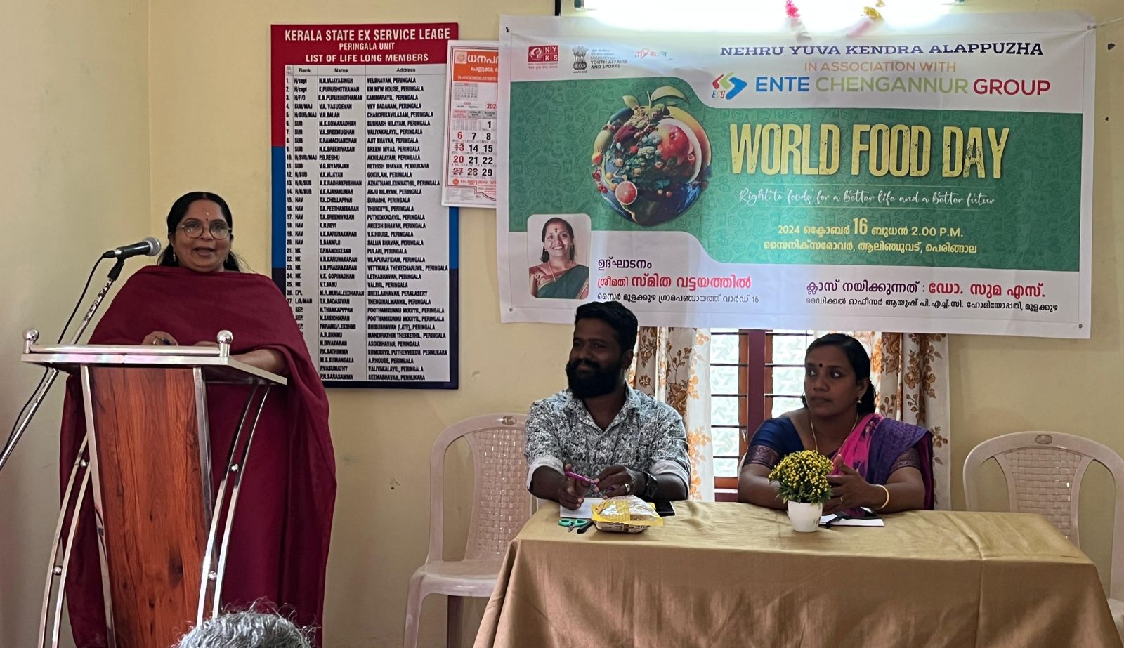 ഇന്ത്യാ ഗവണ്മെന്റിന്റെ മാനവ വിഭവശേഷി വികസന മന്ത്രാലയത്തിലെ യുവജനകാര്യ കായിക വകുപ്പിന്റെ ഒരു സ്വയം ഭരണ സ്ഥാപനമായ നെഹ്രു യുവ കേന്ദ്ര ആലപ്പുഴയും സംയുക്തമായി ഒക്ടോബർ മാസത്തിലെ അന്തർദേശീയ ദിനാചരണങ്ങളിൽപ്പെട്ട ലോക ഭക്ഷ്യദിനത്തിൽ തെറ്റായ ഭക്ഷണ രീതികൾ മൂലമുണ്ടാകുന്ന രോഗാവസ്ഥകളെ പറ്റിയും , മായം കലർന്ന വിഷത്തിൽ മുങ്ങിയ ഭക്ഷണ വസ്തുക്കൾ മൂലമുണ്ടാകുന്ന വിപത്തുകൾ , ജങ്ക് ഫുഡുകൾ മൂലം കുഞ്ഞുങ്ങൾ നേരിടുന്ന പ്രശ്നങ്ങൾ, പ്രമേഹം കാൻസർ കിഡ്നിരോഗങ്ങൾ പോലെയുള്ള രോഗങ്ങൾ സാധാരണമാകുന്ന ഈ കാല ഘട്ടത്തിൽ ഡോ. സുമ. എസ് (Medical Officer, Ayush PHC Homoeopathy, Mulakuzha) ന്റെ നേതൃതത്തിൽ ഒക്ടോബർ 16 ബുധനാഴ്ച ചെങ്ങന്നൂർ , പെരിങ്ങാല അലിഞ്ചുവട് സൈനിക് സരോവറിൽ വച്ച് ആരോഗ്യകരമായ ഭക്ഷണ രീതിക്കളെക്കുറിച്ച് അവബോധം സൃഷ്ടിക്കുവാനായി ആഹാരവും ആരോഗ്യവും എന്ന വിഷയത്തിൽ ഒരു ബോധവൽക്കരണ ക്ലാസും , ഭേഷജം പ്രസന്നകുമാർന്റെ നേതൃതത്തിൽ മില്ലറ്റ് മറ്റ് ഔഷധ കൂട്ടുകൾ ഉപയോഗിച്ച് ചാപ്പി പാനീയവും , തിന പായസം, ചാമ ഉപ്പുമാവ്എന്നീ ഹെൽത്തി ഫുഡ് പ്രമോഷനും സംഘടിപ്പിച്ചു. യോഗം സ്മിത വട്ടയത്തിൽ ( മെമ്പർ വാർഡ് 16 മുളക്കുഴ ഗ്രാമ പഞ്ചായത്ത്) ഉദ്ഘാടനം ചെയ്തു പ്രഡിഡന്റ് ജോൺസൺ ജികെ അധ്യക്ഷത വഹിച്ചു