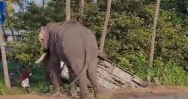 ലോറിയിൽ നിന്നും ഇറക്കുന്നതിനിടെ ആന ഇടഞ്ഞു; കാറും രണ്ട് ടെംപോ ട്രാവലറും തകർത്ത്