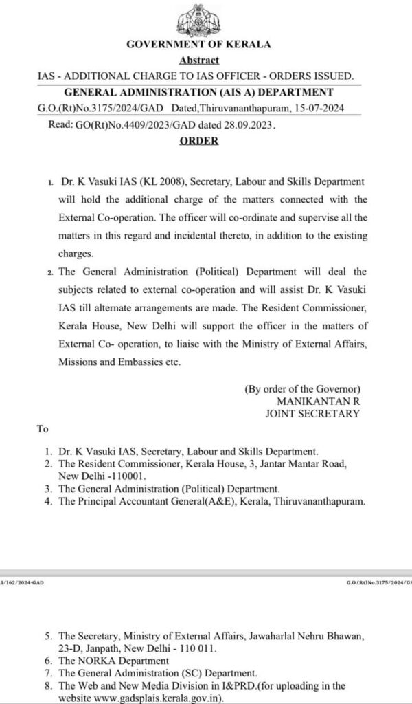 അതേസമയം വാർത്ത നിഷേധിച്ച് ചീഫ് സെക്രട്ടറി തന്നെ രംഗത്തെത്തി. ഇതൊരു പുതിയ പോസ്റ്റല്ലെന്നും നേരത്തെയും ഈ ചുമതലയുള്ള ഒരു ഐഎഎസ് ഉദ്യോഗസ്ഥൻ ഉണ്ടായിരുന്നുവെന്നും അദ്ദേഹം പറഞ്ഞു. കേരള സർക്കാരിന് വിദേശ സ്ഥാപനങ്ങളുമായി പദ്ധതികളുണ്ട്, ആ പദ്ധതികൾ ഏകോപിപ്പിക്കുന്നതിനാണ് ഇത്. ഇതിന് ഒരു വിദേശ സർക്കാരുമായും ബന്ധമില്ല. പ്രവാസി മലയാളികളുടെ വിഷയങ്ങൾ ഏകോപിപ്പിക്കുന്ന സംസ്ഥാനത്തെ നോർക്കയുടെ സെക്രട്ടറിയാണ് ഡോ.വാസുകി ഐഎഎസ്. അതിനാലാണ് ഇപ്പോൾ അധിക ചുമതല നൽകിയതെന്നും അദ്ദേഹം ഫേസ്ബുക്ക് പോസ്റ്റിൽ പറഞ്ഞു.